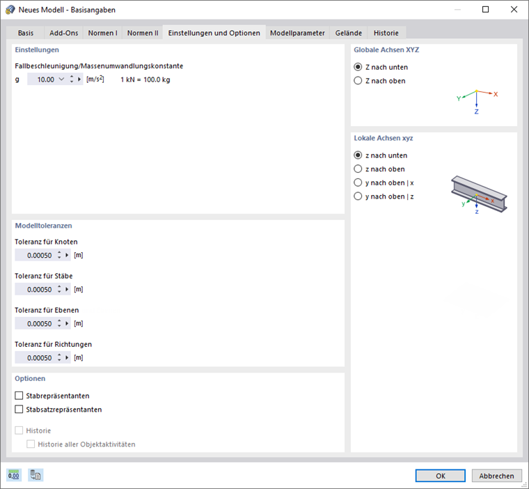 Dieser Abschnitt regelt die Ausrichtung der globalen Achse Z. In CAD-Anwendungen zeigt die Z-Achse meist nach oben, in Statikprogrammen nach unten. Für die Berechnung spielt dies keine Rolle.