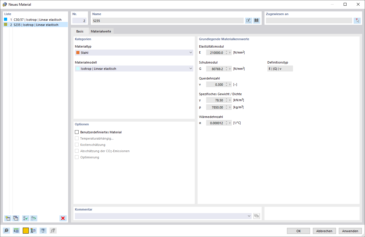 Im Dialog 'Neues Material' definierte Beton- und Stahlmaterialien