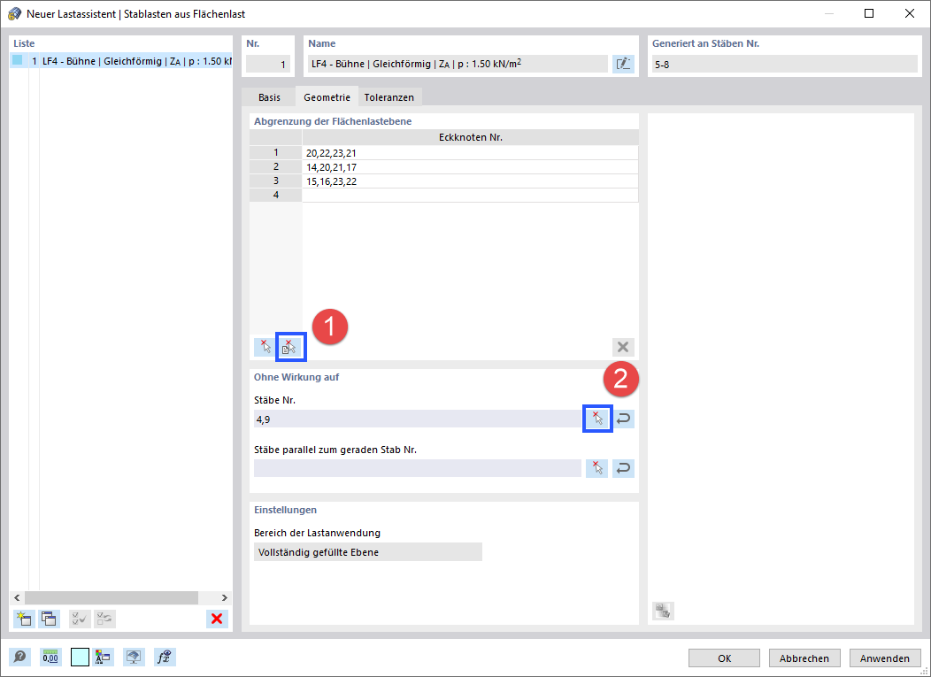 Reiter 'Geometrie' mit Funktionen zur grafischen Definition der Lastfläche