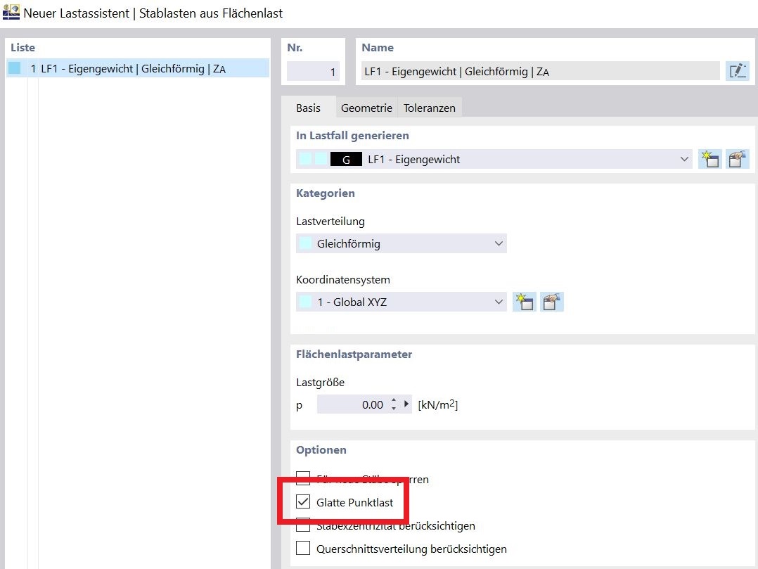 Option "Glatte Punktlast" im Lastassistenten "Stablast aus Flächenlast"