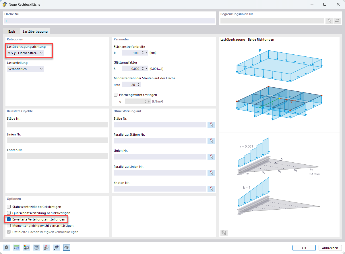 KB 001926 | Das Bild zeigt ein Softwarefenster mit erweiterten Einstellungen zur Lastübertragung auf Flächen. Es enthält Eingabefelder für Flächenstreifenbreite und Stichprobenfaktor.