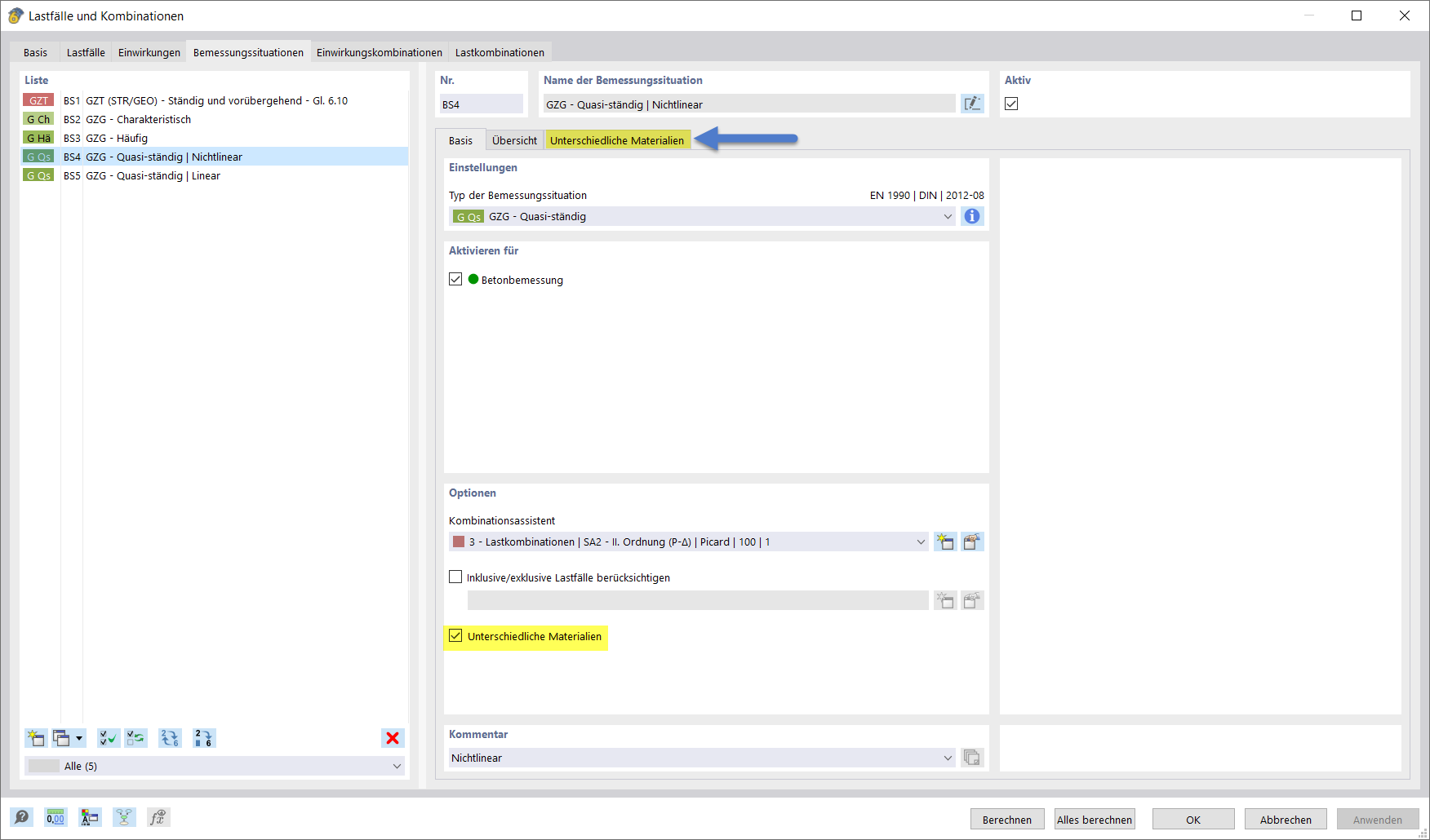 Einstellung für Bemessungssituationen in RFEM 6 mit verschiedenen Materialien aktiviert.