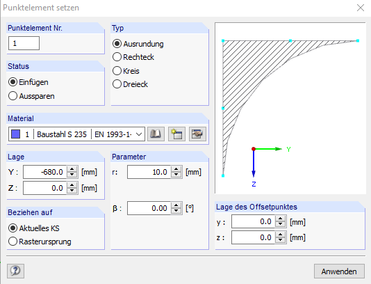Die Punktelemente können grafisch an Fangpunkten des Querschnitts gesetzt werden.