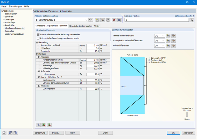 Im RFEM 5-Zusatzmodul RF-GLAS können diese klimatischen Beanspruchungen mit einbezogen werden. Hierfür ist für jede Klimalast ein eigener Lastfall zu erstellen. Die Klimalasten setzen sich zusammen aus Temperaturdifferenzen, Druckdifferenzen und Höhendifferenzen.