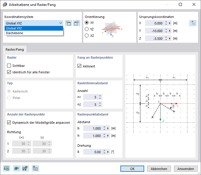 Das Raster der Benutzeroberfläche dient hauptsächlich als Eingabehilfe in der Arbeitsebene. Die Rasterpunkte können bei der Eingabe der Modelldaten gefangen werden. Auf diese Weise ist eine schnelle und exakte Arbeitsweise möglich.