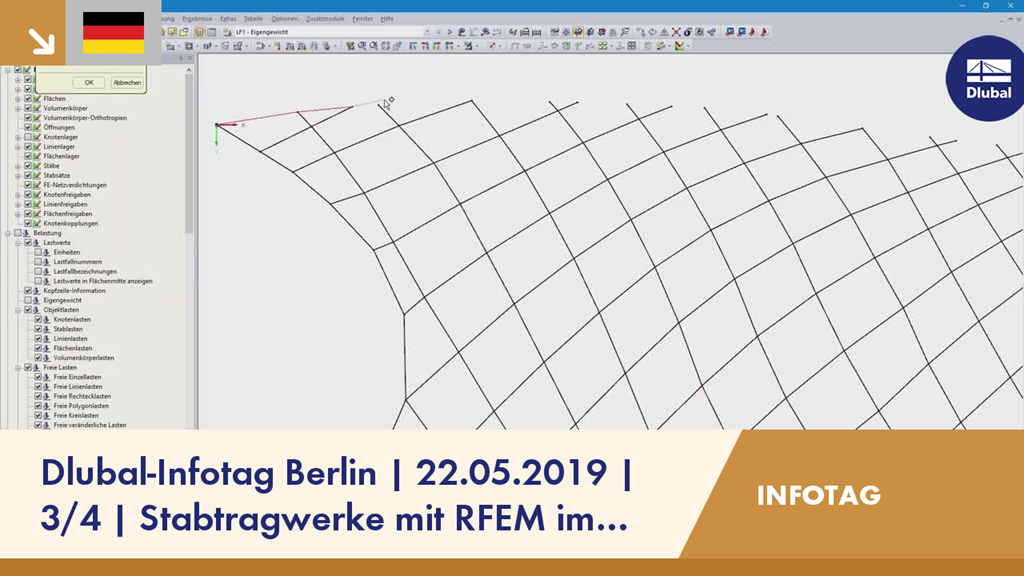 Im dritten Teil der Aufzeichnung vom Dlubal-Infotag in Berlin zeigt Ihnen Gerhard Rehm, wie einfach Sie eine komplexe Holzkonstruktion aus dem CAD/CAM-Programm Cadwork in das FEM-Statikprogramm RFEM importieren und Schnee- sowie Windbelastungen auf Stabzellen ansetzen. Im Anschluss werden mit den Zusatzmodulen RF-STABIL und RF-HOLZ Pro Querschnitts- und Stabilitätsnachweise geführt.