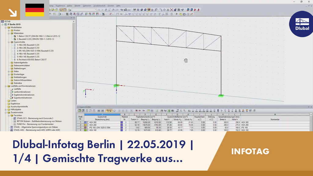 Im ersten Teil der Aufzeichnung vom Dlubal-Infotag in Berlin zeigt Ihnen Paul Kieloch, wie Sie effektiv gemischte Tragwerke aus Stahl und Beton in dem Stabwerksprogramm RSTAB modellieren und bemessen.