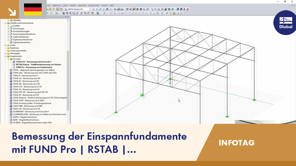 Im 1. Block der Aufzeichnung vom Dlubal-Infotag zeigt Ihnen Paul Kieloch, wie Sie effektiv gemischte Tragwerke aus Stahl und Beton in dem Stabwerksprogramm RSTAB modellieren und bemessen. Sehen Sie in diesem Teil die Bemessung der Fundamente nach Eurocode 2 im Zusatzmodul FUND Pro.