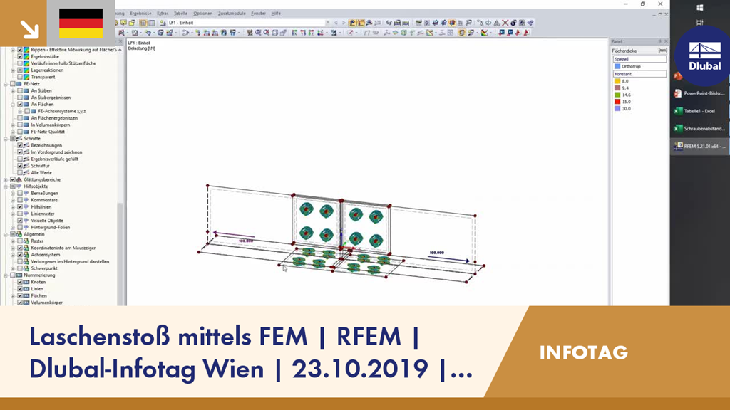 Im 2. Teil der Aufzeichnung vom Dlubal-Infotag zeigt Ihnen Andreas Niemeier am Beispiel eines Laschenstoßes den Nachweis einer beliebigen Stahlverbindung mit Hilfe der Finite-Elemente-Methode in RFEM.