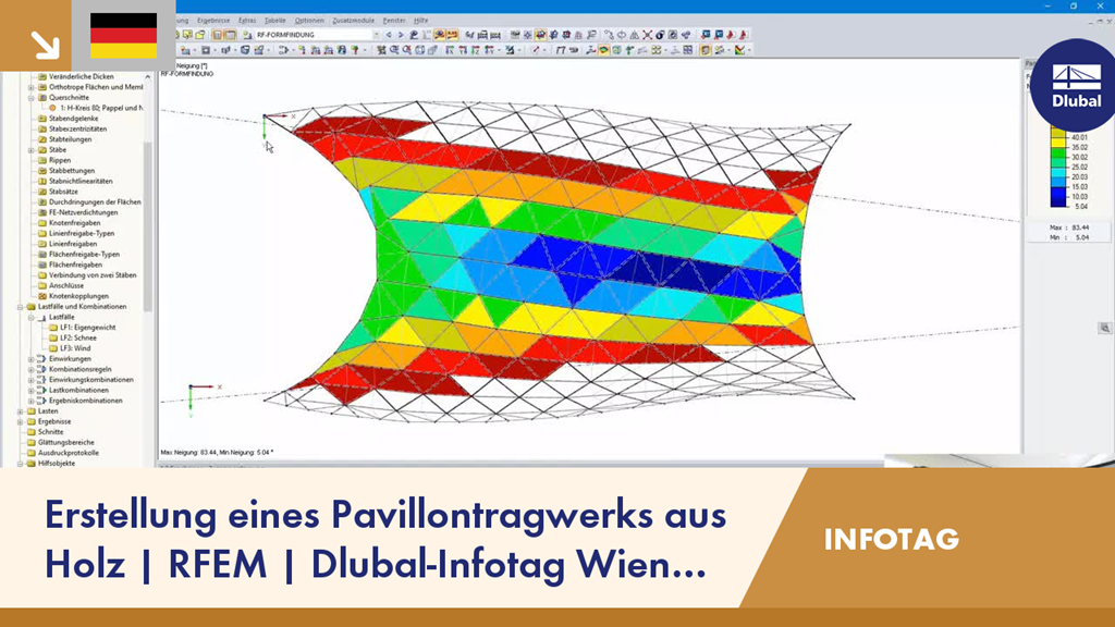 Im 3. Teil der Aufzeichnung vom Dlubal-Infotag zeigt Ihnen Gerhard Rehm dem Import eines Pavillons aus Cadwork. Das über das STP-Format importierte Modell wird dann in RFEM angepasst und mit belastet. Für den genauen Ansatz der Windlasten werden die Dachneigungen mittels RF-Formfindung untersucht.