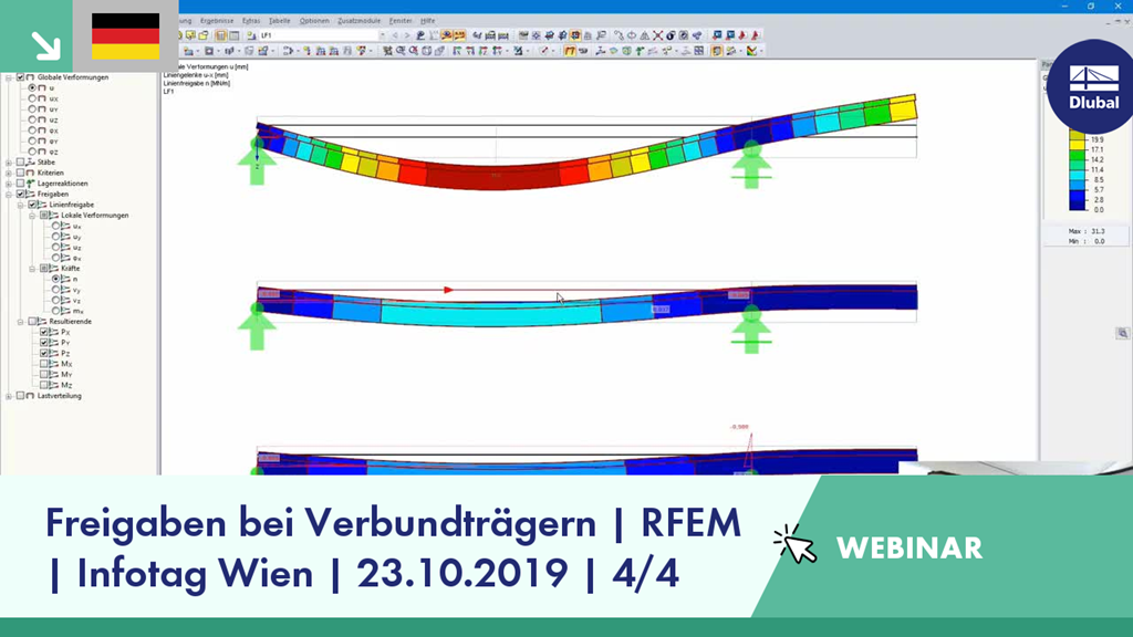 Im letzten Teil der Aufzeichnung vom Dlubal-Infotag zeigt Ihnen Gerhard Rehm die Abbildung von Verbundträgern mit Hilfe von Linienfreigaben und Stabexzentrizitäten.