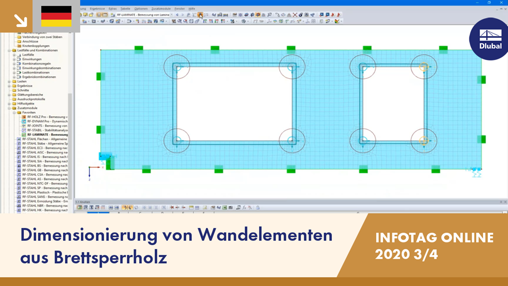 Im dritten Teil der Aufzeichnung vom Dlubal-Infotag Online zeigt Ihnen Gerhard Rehm die grundsätzliche Vorgehensweise für die Dimensionierung von Wandelementen aus Brettsperrholz mit RF-LAMINATE in RFEM.