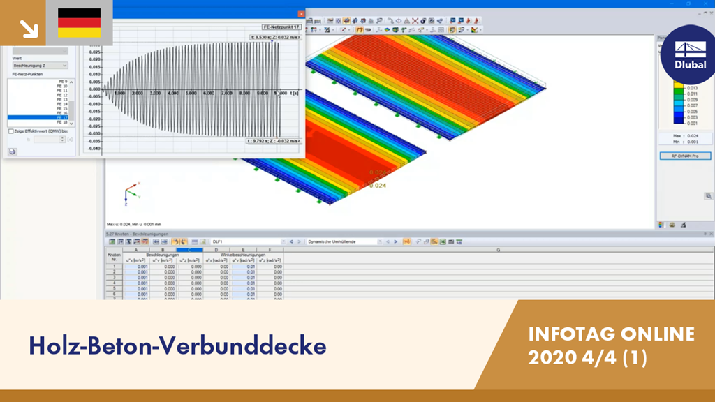 Im vierten Teil der Aufzeichnung vom Dlubal-Infotag Online zeigt Ihnen Gerhard Rehm den Schwingungsnachweis einer Holz-Beton-Verbunddecke.