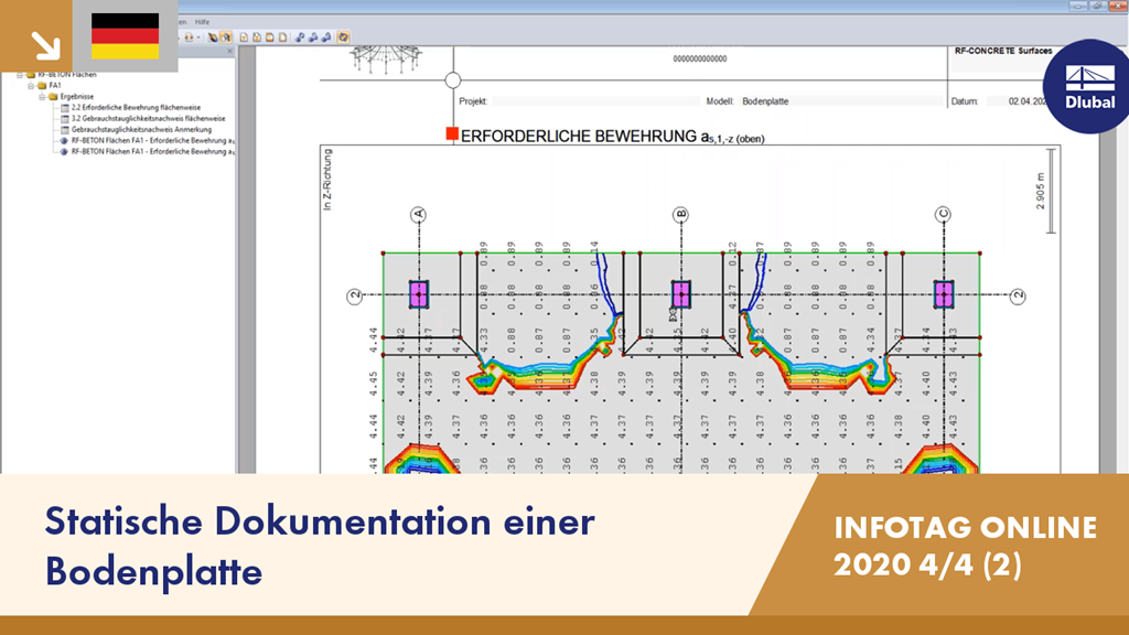 Im vierten Teil der Aufzeichnung vom Dlubal-Infotag Online zeigt Ihnen Paul Kieloch die grafische Dokumentation der Ergebnisse aus der RF-BETON Flächen einer Bodenplatte.