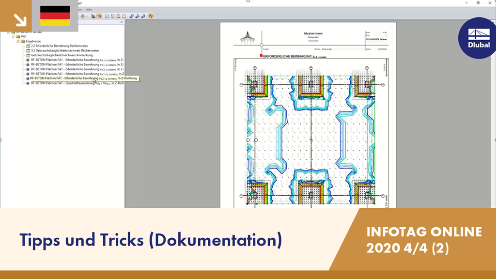 Im vierten Teil der Aufzeichnung vom Dlubal-Infotag Online zeigt Ihnen Paul Kieloch die grafische Dokumentation der Ergebnisse aus der RF-BETON Flächen einer Bodenplatte.