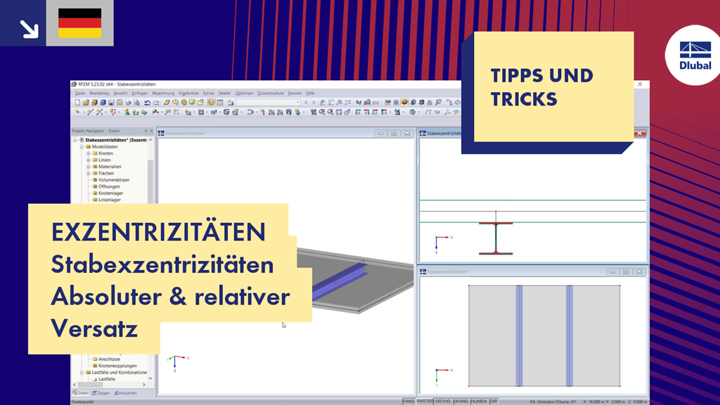 In diesem Video werden die beiden Möglichkeiten absoluter Versatz und relativer Versatz zur Erzeugung von Stabexzentrizitäten gezeigt. Es wird erläutert welchen Einfluss eine Exzentrizität auf die resultierenden Schnittgrößen haben kann.
