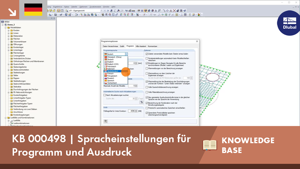 RFEM, RSTAB und DUENQ sind in elf Sprachen lokalisiert. Alle Sprachen stehen ohne Aufpreis zur Verfügung. Die Sprache der Programmoberfläche kann über das Menü "Optionen" → "Programmoptionen" festgelegt werden. Die Sprache für die Druckausgabe wiederum ist unabhängig von der Sprache der Programmoberfläche. Damit lässt sich zum Beispiel ein spanisches Ausdruckprotokoll in einer italienischen Benutzeroberfläche erzeugen.