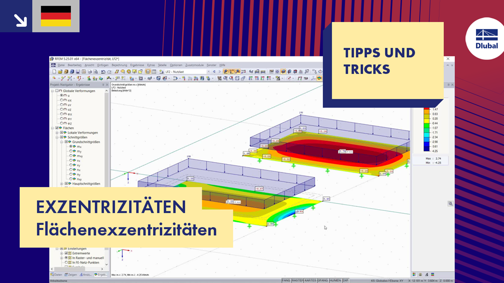 In diesem Video wird gezeigt, wie Flächenexzentrizitäten modelliert werden können. Es wird erläutert welchen Einfluss eine Exzentrizität auf die resultierenden Schnittgrößen haben kann.