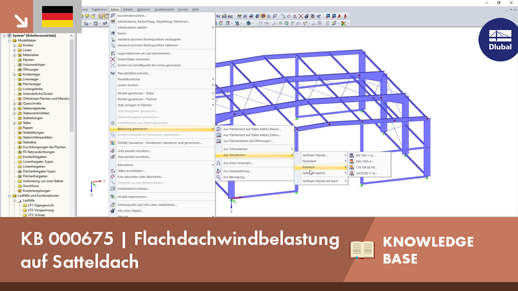 Das Programm RFEM 5 bzw. RSTAB 8 bietet für die Aufbringung von Windlasten auf Dächer einen Generator für geknickte Satteldachformen und ebene Flachdachformen an. Der Sonderfall einer flach geknickten Satteldachform kleiner 5 Grad wird von dem Lastgenerator Satteldachformen erkannt. In dieser Situation bringt der Generator ein Lastbild für ein äquivalentes Flachdach auf.