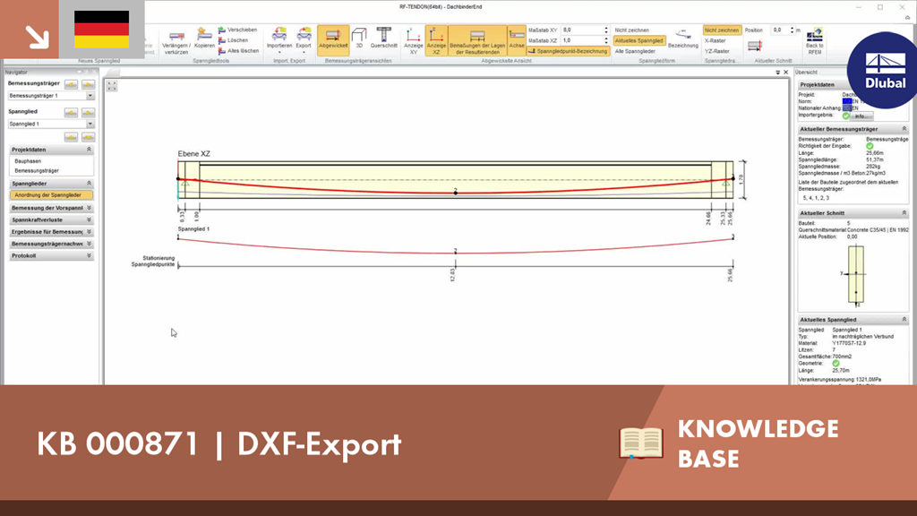 Nachdem in RF-TENDON die endgültige Spanngliedgeometrie ermittelt wurde, kann der Export in ein CAD-Programm nützlich sein. Dazu steht unter anderem der Export in das Dateiformat .dxf zur Verfügung. Die Exportfunktion ist über einen Rechtsklick in den Arbeitsbereich auswählbar. Nach der Auswahl des DXF-Formats und des Speicherorts können zusätzliche Einstellungen vorgenommen werden.