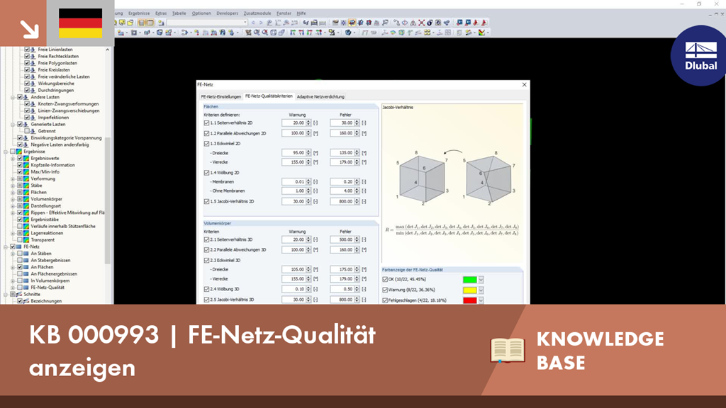 Als Hilfsmittel bei statischen Berechnungen von flächigen Bauteilen besteht in RFEM die Möglichkeit der Anzeige der FE-Netz-Qualität. Hierbei wird eine interne Kontrolle der erzeugten FE-Elemente für definierte Kriterien durchgeführt.