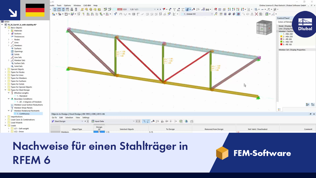 In diesem Video wird gezeigt, wie die Knicklänge sowie Randbedingungen Stäben und Stabsätzen für den Stabilitätsnachweis zugewiesen werden können. Wenn das geschehen ist, kann das Programm die Querschnitts- und Stabilitätsnachweise für diesen Träger automatisch durchführen.