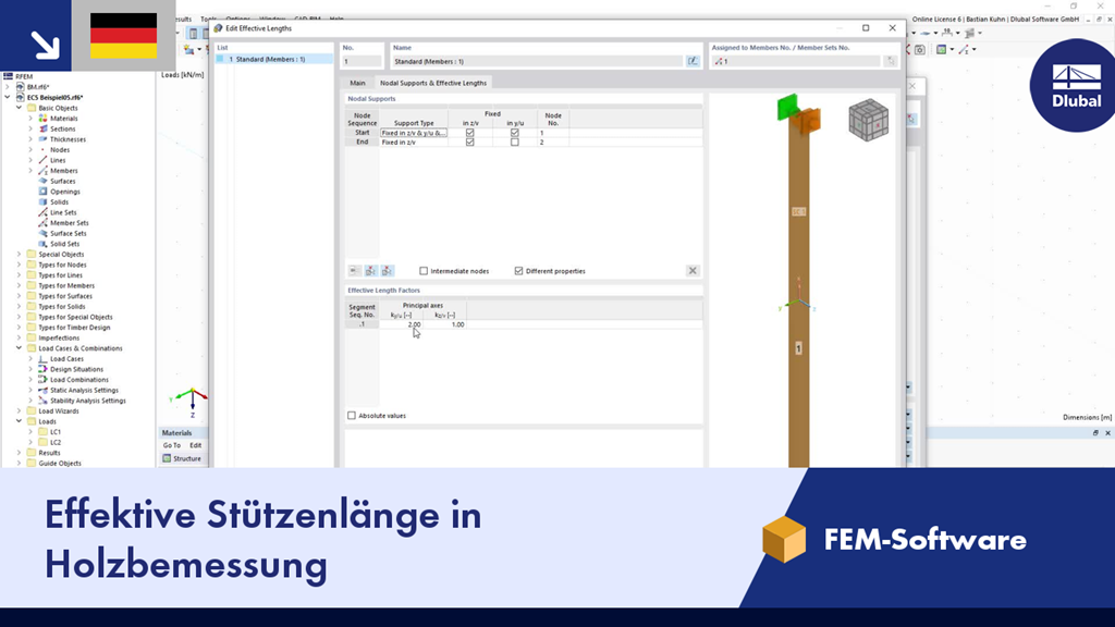 In diesem Video sehen Sie, wie man verschiedene Knicklängen für eine Stütze definiert. Des Weiteren kann auch eine Steifigkeitsreduzierung infolge Kriechen für den Stabilitätsnachweis in der Holzbemessung berücksichtigt werden.