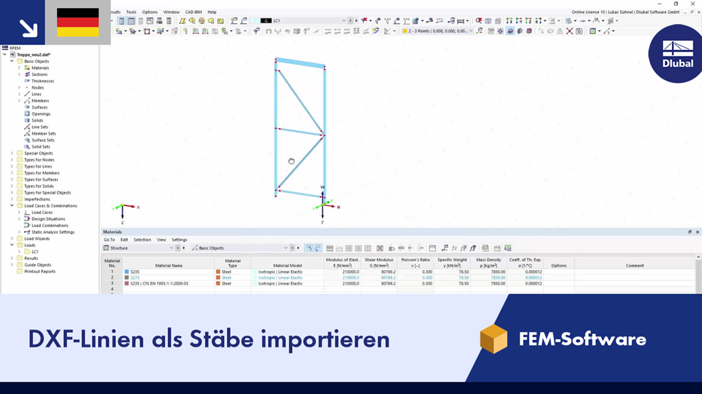 In diesem Video wird der Import einer DXF-Datei gezeigt. Die Bezeichnung der Layer beinhaltet den Profil- und den Materialnamen. RFEM nutzt die Informationen beim Import, um die Linien in Stäbe umzuwandeln.