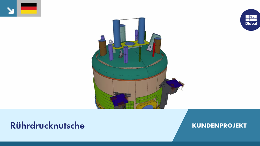 Bei diesem Projekt wurde für einen Filter/Trockner mit Rührwerk eine vollständige Spannungs- und Verformungsanalyse mit RFEM durchgeführt. Die Besonderheit der Struktur lag in der aufwendigen Modellierung mit 1424 Flächen, 158 Volumen und 425 Stäben.