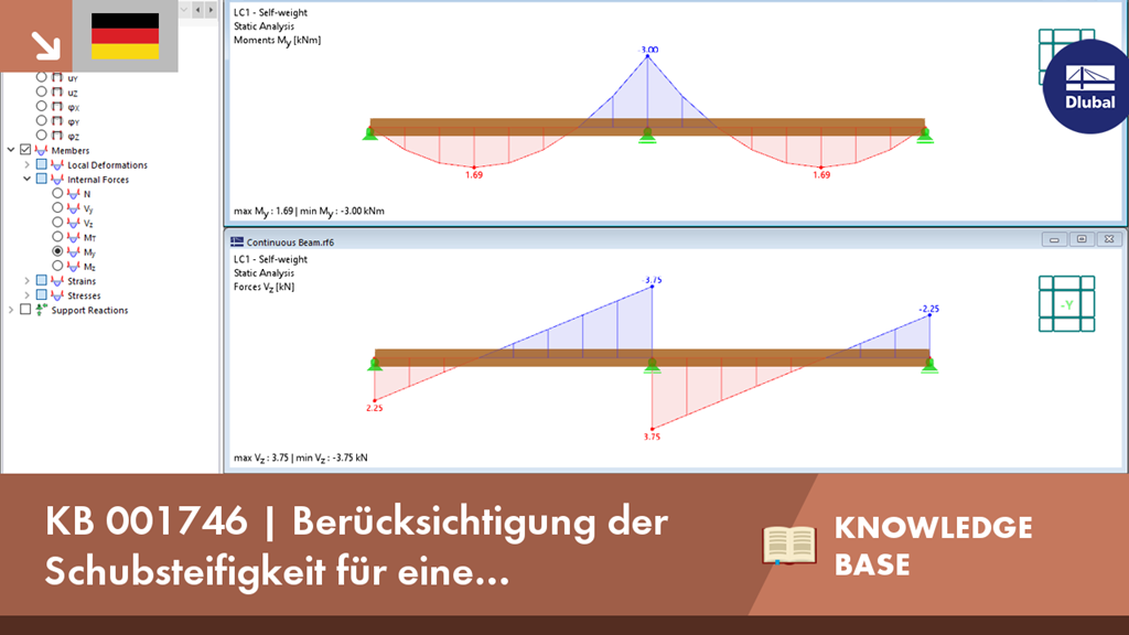 In diesem Video werden die Schnittgrößen und Verschiebungen eines Durchlaufträgers gezeigt, die sowohl mit als auch ohne Berücksichtigung der Schubsteifigkeit berechnet wurden.