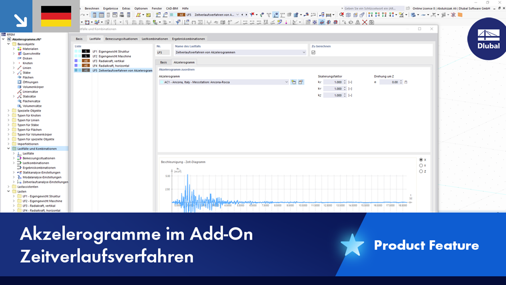 Im Add-On Zeitverlaufsverfahren stehen Ihnen Akzelerogramme für die Berechnung zur Verfügung. Diese Erweiterung ermöglicht die dynamische Tragwerksanalyse von Beschleunigungs-Zeit-Diagrammen.