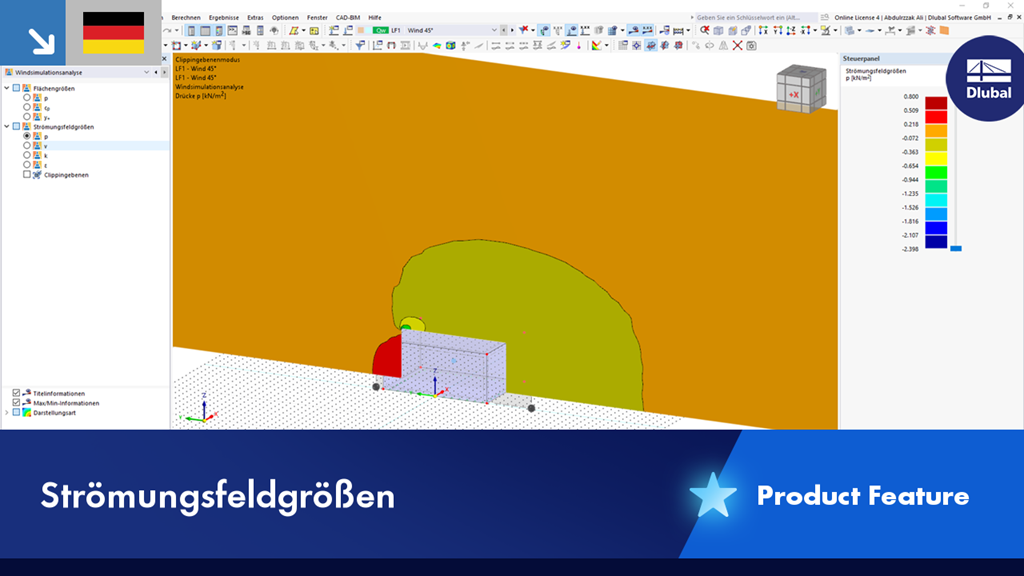 In RFEM und RSTAB haben Sie die Möglichkeit, sich für die Windsimulation die Strömungsfeldgrößen Druck, Geschwindigkeit, kinetische Turbulenzenergie und Turbulenzdissipationsrate visualisieren zu lassen.