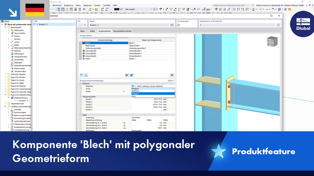 Im Add-On Stahlanschlüsse können Sie Bleche in verschiedenen Geometrieformen anordnen. Dabei steht Ihnen neben den Formen "Rechteck" und "Kreis" auch die Form "Polygon" zur Verfügung. Die polygonale Form wird dabei über die Eingabe von Punktkoordinaten definiert.