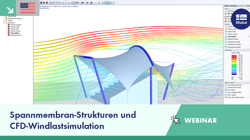 In diesem Webinar wird der allgemeine Arbeitsablauf für die Bemessung von gespannten Membrankonstruktionen in RFEM einschließlich der CFD-Windlastanalyse mit RWIND Simulation vorgeführt.