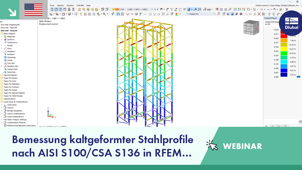 Dieses Webinar bietet eine Einführung in die Bemessung kaltgeformter Stahlprofile nach AISI S100 / CSA S136 in RFEM 6.