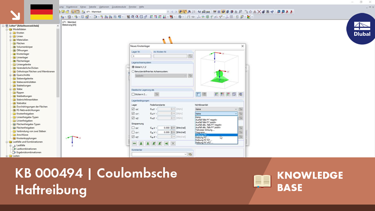 Da die Querkrafttragfähigkeit zwischen zwei Elementen einen Einfluss auf das Kräftespiel im Gesamtmodell hat, erlauben RFEM und RSTAB eine Haftreibungskopplung an Lager-, Gelenk- und Freigabedefinitionen. Dieser Ansatz simuliert die Reibung durch einen automatisierten iterativen Berechnungsprozess, welcher nach jeder Iteration die Haftreibungsbedingung überprüft und entsprechende Maßnahmen zur Einhaltung der Gesetzmäßigkeiten vornimmt. Die Funktion wurde so ausgebildet, dass der Anwender den Koppelfreiheitsgraden direkt vorgibt, in welcher Richtung die Reibungskraft verläuft und aus welcher Richtung die Druckkraft kommt.