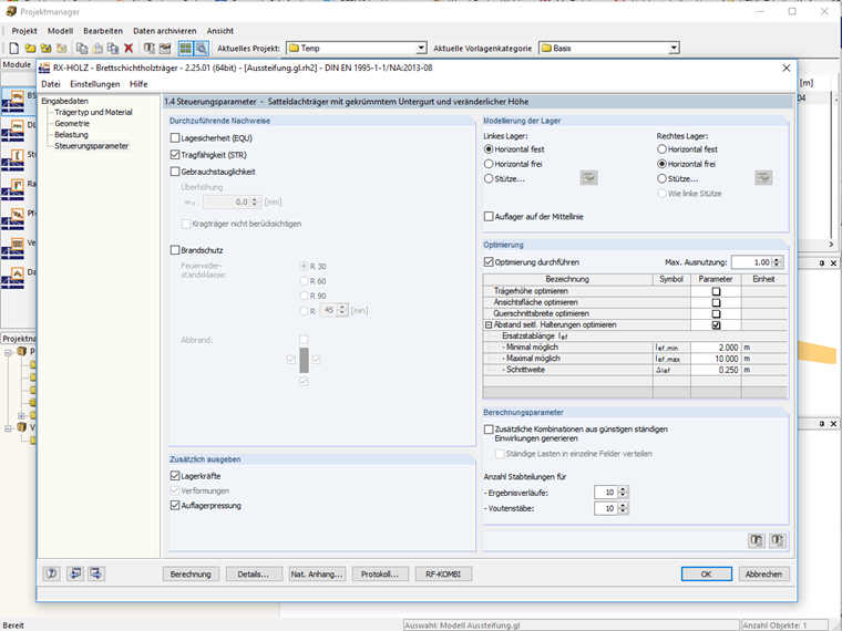 Die Kipplänge im Nachweis Brandschutz kann identisch mit der Kipplänge im Tragfähigkeitsnachweis angesetzt werden. Alternativ kann hier auch die komplette Trägerlänge angesetzt werden. Dies berücksichtigt einen Ausfall der Kippaussteifungen im Brandfall.