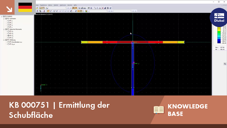 Im abgebildeten Beispiel ist die Schubfläche eines T-Querschnitts berechnet worden. Dabei wird in DUENQ nicht die vereinfachte Formel nach DIN oder Eurocode verwendet, sondern die Schubfläche mit Hilfe des Flächenmomentes 1. Grades ermittelt. Dieses Verfahren lässt sich dabei für alle Querschnittsformen anwenden.