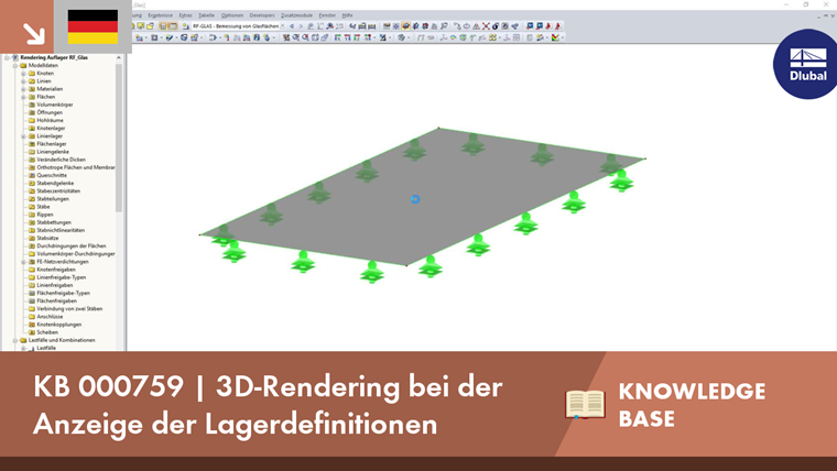 Im Zusatzmodul RF-GLAS ist zur Erleichterung der Definition der Auflagerbedingungen das 3D-Rendering implementiert. Durch diese interaktive graphische Visualisierung wird dem Anwender eine erleichterte Eingabe und Kontrolle der Linien- und Knotenlagerung ermöglicht. Die schematische Darstellung kann bei Bedarf jedoch auch ausgewählt werden.