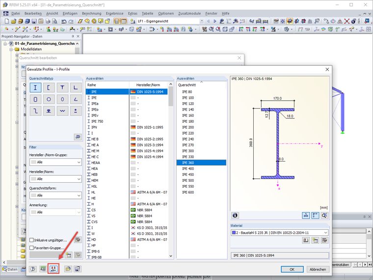 Eine weitere sehr effektive und vielfältige Option bietet die Verwendung von Parametern aus der der Parameterliste unter Berücksichtigung von Querschnittsparametern. Es können dort beliebige Variablen angelegt werden, auch über Formeln mit Bezug zu anderen Variablen oder wie beschrieben mit dem Auslesen von Querschnittsparametern.