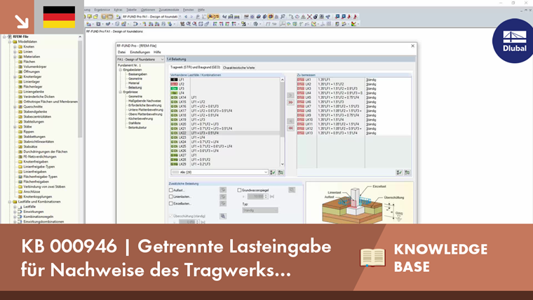 Dem Anwender bietet RF-/FUND Pro aber auch die Möglichkeit, dies bei Bedarf zu ändern. Hierzu muss in den "Details" der Haken bei "Für (STR) und (GEO) gleiche Lasten anwenden" entfernt werden. Durch diese Auswahl wird die Eingabemaske "1.4 Belastung" angepasst, sodass die Eingabe der Belastung für die Nachweise des Tragwerks und des Baugrunds getrennt durchgeführt werden kann.