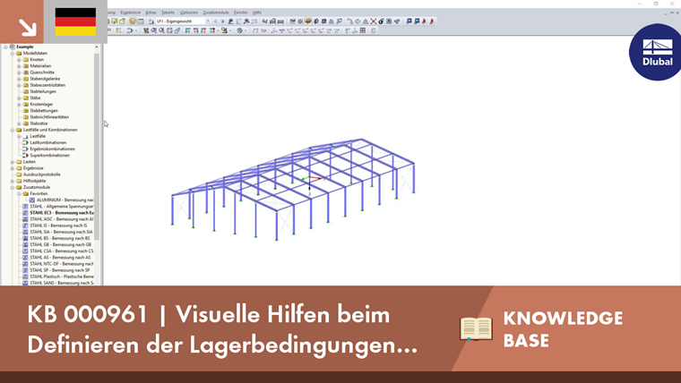 In RF-/STAHL EC3 gibt es daher in der Maske 1.7 eine graphische Anzeige der Struktur. Die Anzeige der Struktur ist interaktiv. Man kann hier zoomen und verschieben. Sehr hilfreich sind die Schaltflächen unterhalb der Grafikanzeige. Hierüber kann der Rest der Struktur ausgeblendet oder im Hintergrund angezeigt werden. Besonders empfehlenswert ist das Einblenden des Stabsatz-Koordinatensystems mit Darstellung der in Maske 1.7 definierten Auflager. So können Fehler bei der Definition der Randbedingungen einfach vermieden werden.