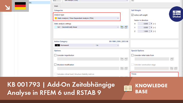 Sowohl in RFEM 6 als auch in RSTAB 9 ist es möglich, die zeitabhängigen Faktoren mit dem Add-On "Zeitabhängige Analyse (TDA)" zu berücksichtigen. Nach dem Erwerb können Sie dieses Add-On wie in Bild 1 gezeigt in den Basisangaben aktivieren.