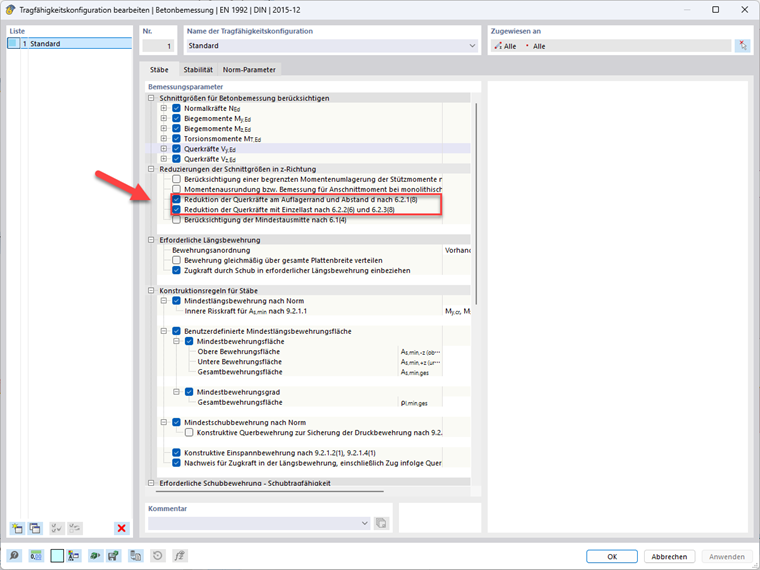 Das Auswerten des Querkraftverlaufs ist also die Grundlage für die hier angesprochene Abminderung der Querkraft. Daraus ergibt sich auch die Einschränkung, dass diese Optionen bei der Bemessung mit einer Ergebniskombination (EK) nicht zur Verfügung stehen, da bei einer EK nicht zwingend von einer gleichmäßig verteilen Last ausgegangen werden kann.