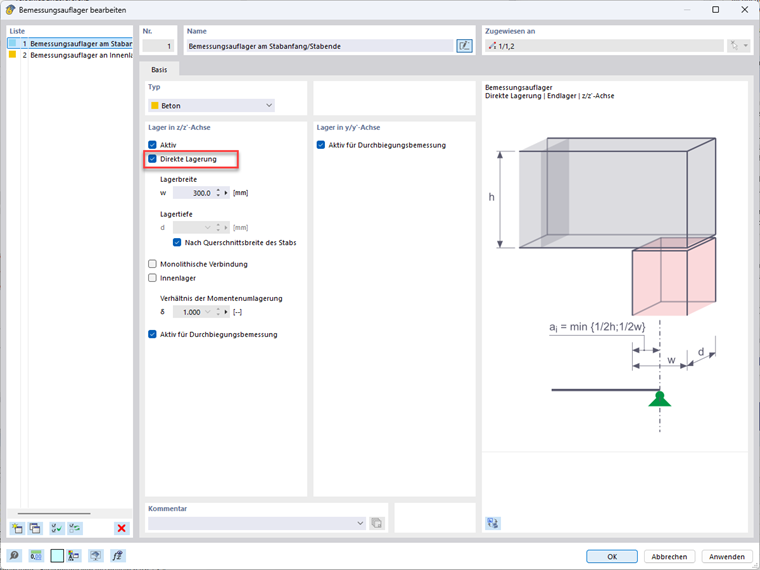 In den Einstellungen für das Bemessungsauflager können Sie sich für eine Lagerbreite und eine Lagerart entscheiden.
