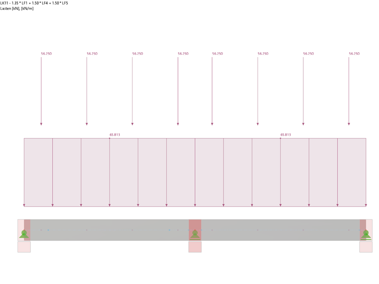 Zur Erläuterung der Reduktion von auflagernahen Einzellasten wird der bisher behandelte Zweifeldträger nun für die Lastkombination LK11 mit auflagernahen Einzellasten und einer Gleichstreckenlast bemessen.