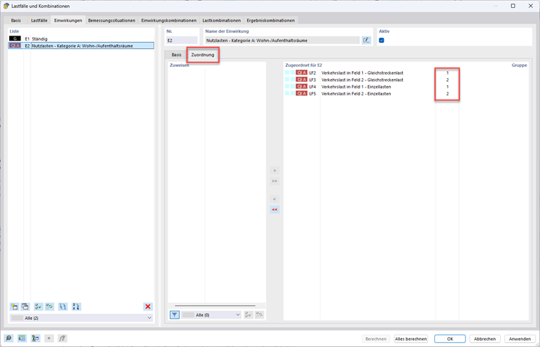 Diese beiden Lasten werden für das jeweilige Feld getrennt eingegeben und bei der Kombinatorik alternativ behandelt. In RFEM und RSTAB wird zur Bildung der Lastkombinationen für den GZT und GZG die automatische Kombinatorik aktiviert. Damit die alternativen Lastfälle mit den Strecken- oder Einzellasten nicht miteinander kombiniert werden, werden diese jeweils einer Gruppe zugeordnet. Die weiteren Eingaben in RFEM 6 und RSTAB 9 können auch aus der zum Download zur Verfügung gestellten Datei entnommen werden.