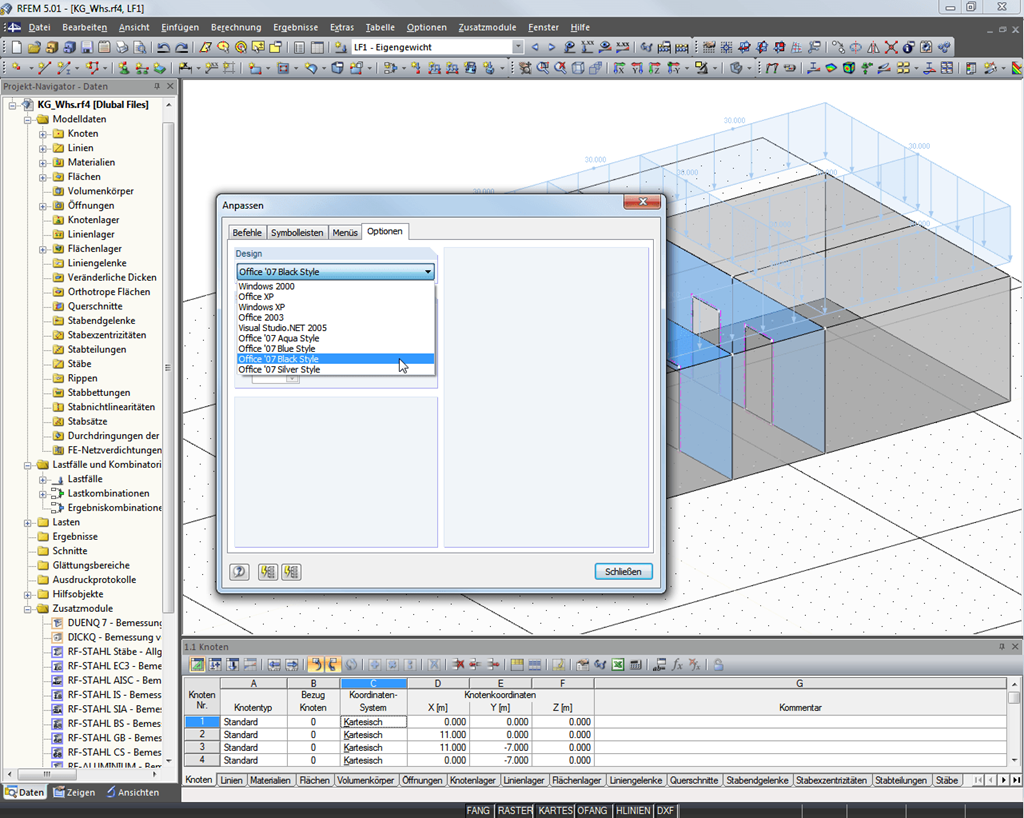 Zudem können Sie das Design der Benutzeroberfläche von RFEM/RSTAB modifizieren: Es stehen neun verschiedene Oberflächen-Styles zur Auswahl, z. B. Office 2007 Blue, Silver, Aqua oder Black. Passen Sie die Programme Ihren individuellen Wünschen an.