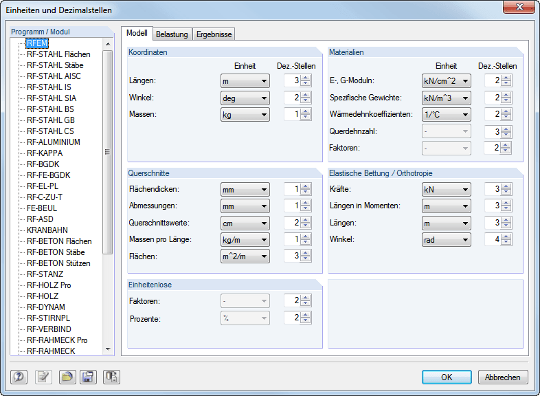 Ein zentraler Dialog steuert die Einheiten für Eingabedaten, Lasten und Ergebnisse von RFEM/RSTAB sowie für sämtliche Zusatzmodule.