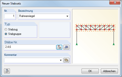 Stäbe können exzentrisch angeordnet, elastisch gebettet oder als starre Kopplungen definiert werden. Stabsätze erleichtern die Lastanordnung auf mehreren Stäben.